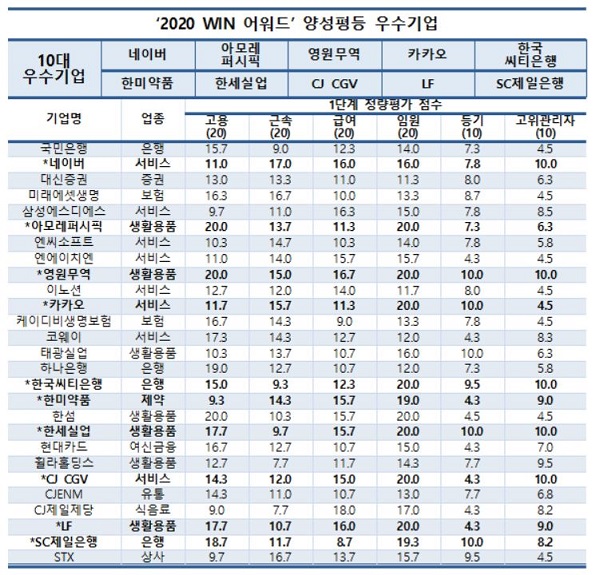 29일 사단법인 위민인이노베이션(이하 WIN, 회장 황지나)과 CEO스코어(대표 박주근)가 국내 500대 기업의 양성평등지수를 평가한 결과, 네이버와 아모레퍼시픽, 영원무역, 카카오, 한국씨티은행, 한미약품, 한세실업, CJ CGV, LF, SC제일은행 등 10곳이 양성평등지수 상위 기업으로 조사됐다.