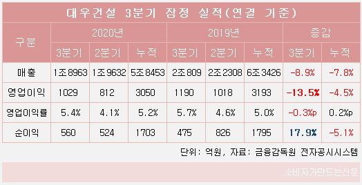 대우건설 관계자는 "코로나19로 국내 분양사업이 일부 순연되고 해외 사업장 공사가 지연된 영향으로 매출이 소폭 감소했다"며 "최근 주택 분양이 순조롭게 이뤄지고 있고 해외 사업장도 차츰 정상화되고 있어 연말부터 매출·영업이익 등 경영실적 반등이 본격적으로 이뤄질 것으로 기대된다"고 말했다.