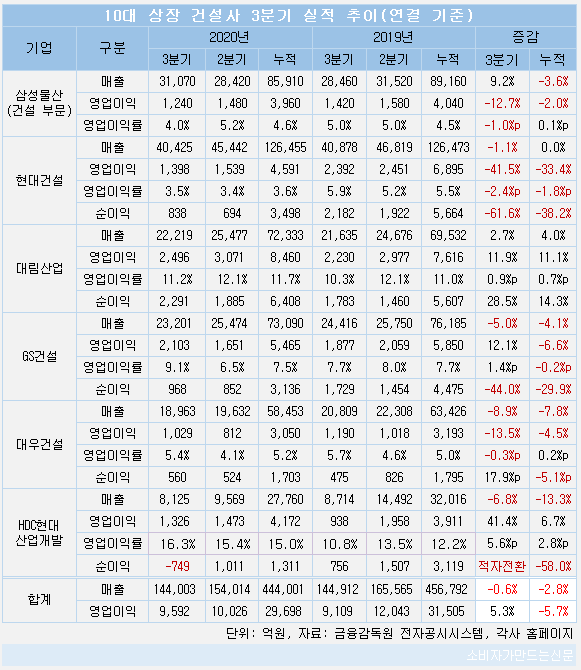 금융감독원 전자 공시에 따르면 국내 시공능력평가 상위 10대 건설사 중 연결 기준 잠정 실적을 발표한 상장사 6곳의 올 3분기 누적 매출은 44조4001억 원으로 전년동기 대비 2.8% 감소할 것으로 집계됐다. 영업이익도 2조9698억 원으로 5.7% 감소할 전망이다.