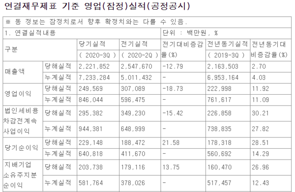 전년동기대비 매출액과 영업이익은 각각 3%, 12%가 증가했다. 3분기 누적 매출액은 7조2333억 원, 영업이익은 8460억 원으로 전년동기대비 각각 4%, 11% 증가했다.