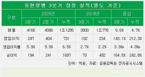 유한양행(사장 이정희)은 별도 기준 매출 4166억 원, 영업이익 247억 원, 순이익 194억 원의 3분기 잠정 실적을 29일 공시했다. 매출과 영업이익, 순이익 모두 지난해 3분기 대비 일제히 늘었다.