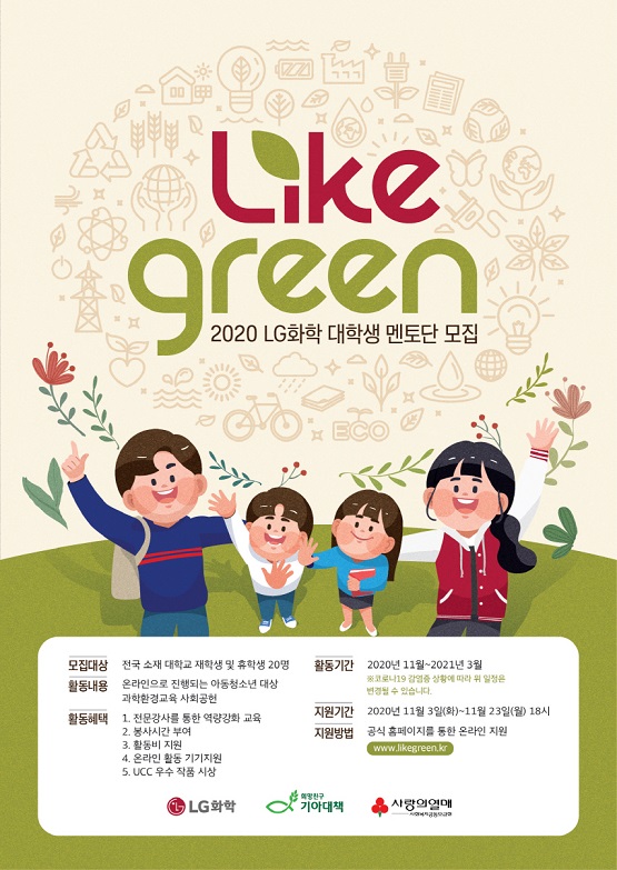 이와 관련 LG화학은 3일부터 ‘LIKE GREEN’을 이끌어 갈 대학생 멘토단을 모집한다. 모집 기간은 이달 23일까지로 환경·과학, 교육봉사에 관심이 많은 전국 소재 대학생 누구나 지원 가능하다.