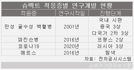 만성 골수성 백혈병 치료제인 슈펙트는 신약 재창출(Drug Repositioning) 방식을 통해 코로나19와 파킨슨병 치료제로 개발되고 있다. 코로나19 임상은 지난 5월 말에, 파킨슨병은 지난 달 초에 각각 돌입한 상태다.