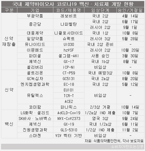 한편 코로나19 백신·치료제 개발에 도전장을 낸 국내 제약바이오사는 현재까지 총 30여 곳에 달하는 것으로 집계됐다. 지난 5월 6일 기준 정부가 중점 지원하겠다고 밝힌 제약사는 21곳(치료제 14곳, 백신 7곳)으로 여기에 종근당·대웅 등이 추가됐다.