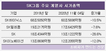 SK하이닉스(대표 이석희), SK텔레콤(대표 박정호), (주)SK(대표 장동현), SK이노베이션(대표 김준) 등 시가총액 10조 원 이상의 핵심 계열사들이 모두 올 들어 주가가 크게 떨어진 상태다.