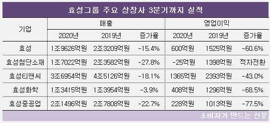 효성그룹은 조현준 회장이 그룹 계열사에 191억 원 손해를 끼치고 16억 원대 회사 자금을 횡령한 혐의로 재판을 진행 중인 점이 인사의 변수가 될 전망이다. 조 회장에 대한 법원의 2심 판결은 11월 25일 나온다. (주)효성(대표 김규영)과 효성첨단소재(대표 황정모), 효성티앤씨(대표 김용섭), 효성화학(대표 이건종), 효성중공업(대표 김동우) 등 주요 계열사들의 올해 실적도 부진한 상황이다.