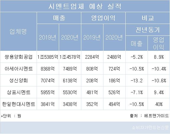 쌍용양회공업의 올해 영업이익전망치는 2488억 원으로 지난해 2284억 원보다 8.9% 늘었다. 삼표시멘트는 지난해 481억 원보다 9.4% 늘어난 526억 원의 영업이익전망치가 나왔다.