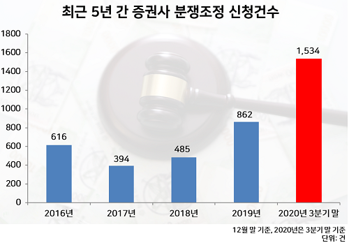특히 증권사에 제기되고 있는 분쟁조정신청건은 매년 급증하는 양상이다. 2017년 394건을 시작으로 이듬해 485건에 이어 지난해에는 862건에 달했다.