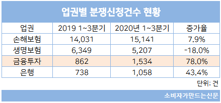 보험업권은 보험금 관련 분쟁이 고정적으로 많았고 은행업권은 대표적인 대면 금융서비스업이라는 점에서 분쟁이나 민원 발생의 개연성이 높지만 금투업권은 '자기투자 책임의 원칙'이 적용된 상품들이라서 민원이나 분쟁이 발생할 소지가 상대적으로 낮았다.