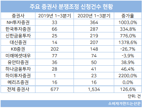 특정지점에서 라임자산운용 펀드를 판매했던 대신증권은 3분기까지 제기된 분쟁조정신청건이 207건으로 전년 대비 14.8배 급증했고 옵티머스 펀드 대부분을 판매했던 NH투자증권도 같은 기간 대비 10배 이상 늘었다.