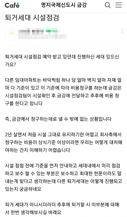 퇴거 예정자들은 아파트 공식 커뮤니티인 네이버 카페를 통해 "점검 전에 원상복구비 기준을 먼저 안내하는 게 순서 아니냐", "에어컨 설치 시 못 자국은 당연한 것인데도 퇴거민들이 도배 비용을 전액 부담해야 하는게 이해가 되지 않는다"며 분통을 터트리는 상황이다.