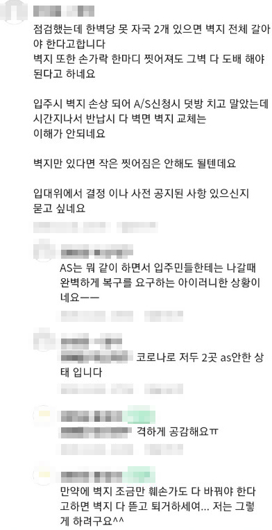 이 씨는 "입주 초기에 벽지가 울어 많은 세대에서 하자보수를 접수한 것으로 아는데 깔끔하게 보수를 받은 사람은 없다. 막상 퇴거한다고 하니 항목별 원상복구비가 얼마인지 기준을 사전 공지하지도 않고 완벽하게 복구를 요구하는 아이러니한 상황"이라며 "퇴거 입주민들은 몇십만 원에 달하는 비용을 '퇴거보수'라는 명목으로 내게 됐다"고 어이없어 했다.