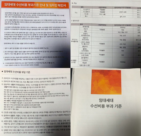 벽걸이TV, 에어컨 등 필수 가전제품 설치 시 불가피하게 발생하는 못 자국, 생활 속 흠집으로 분류되는 바닥 찍힘·벽지 찢김, 아트월 교체 비용 등 사소한 부분까지 수선 대상으로 분류돼 퇴거민이 도배 비용 등을 전액 부담해야 한다는 것이다.