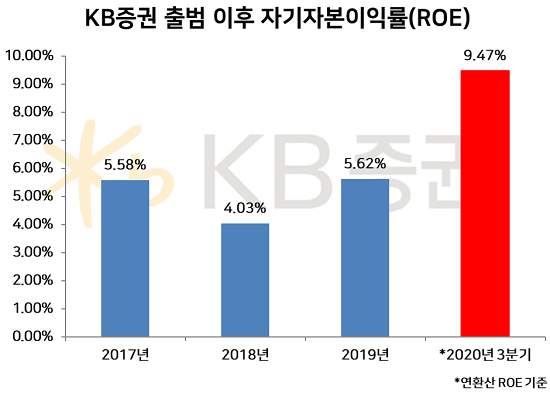KB증권은 지난 2017년 출범 당시 2020년까지 글로벌 스탠다드에 부합한 수준으로 ROE 10% 달성을 주요 경영 목표로 제시한 바 있다.
