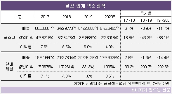 그해 업계 2위 현대제철 영업이익은 30% 이상 감소해 대조를 보였다. 지난해에도 포스코는 매출이 소폭 감소했지만 64조3000억 원대 매출을 유지했다. 영업이익 감소율도 43%로 현대제철(-210%)과 비교하면 낮은 편이다.