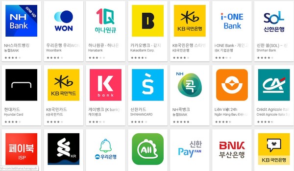 하나은행(행장 지성규), 우리은행(행장 권광석), IBK기업은행(행장 윤종원) 등도 구글 플레이스토어와 애플 앱스토어에 각각 10여개 이상의 앱을 등록해 놓은 상태다.