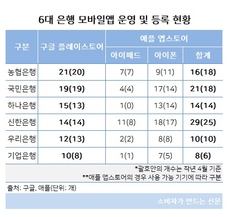 지난해 4월과 올해 11월 현재 기준 구글 플레이스토어와 애플 앱스토어에 등록된 6대 은행의 앱 현황을 조사한 결과 앱 등록 개수가 줄어든 곳은 구글 플레이스토어에서 우리은행, 애플 앱스토어에서는 농협은행, 단 2곳 뿐인 것으로 나타났다.