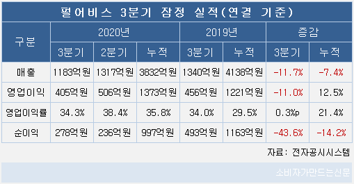 3분기 누적으로 보면 매출은 3832억 원, 영업이익은 1373억 원, 순이익은 997억 원을 기록했다. 전년동기 대비로 영업이익은 12.5% 늘었고 매출과 순이익은 각 7.4% 14.2% 줄었다.