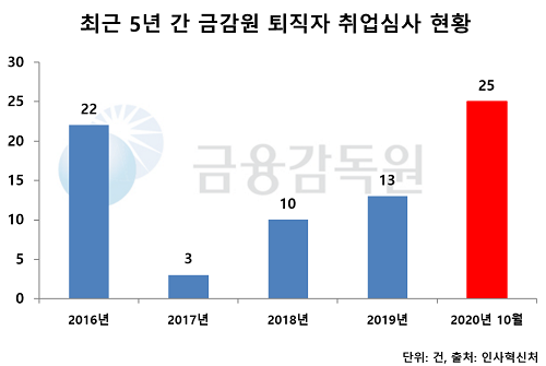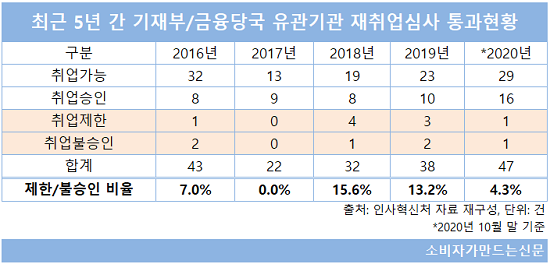 인사혁신처 공직자윤리시스템 자료에 따르면 올해 1월부터 10월까지 기획재정부와 한국은행, 금융위원회, 금융감독원 및 산하 금융공공기관 전직 임직원의 공직자윤리위원회 재취업 심사건은 47건이었다. 지난해 전체 심사건수(38건)보다 9건 더 많았고 '국정농단 사태'가 불거졌던 지난 2017년(22건)에 비해서는 2배 이상 급증했다.