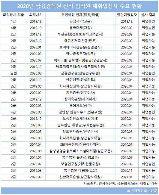 지난 9월 퇴직한 금감원 2급 직원은 신한저축은행 상근감사위원으로의 재취업 심사에서 취업가능 판정을 받았고 지난 6월에도 전직 2급 직원이 삼성생명금융서비스보험대리점 상근고문으로의 재취업 심사를 통과했다.