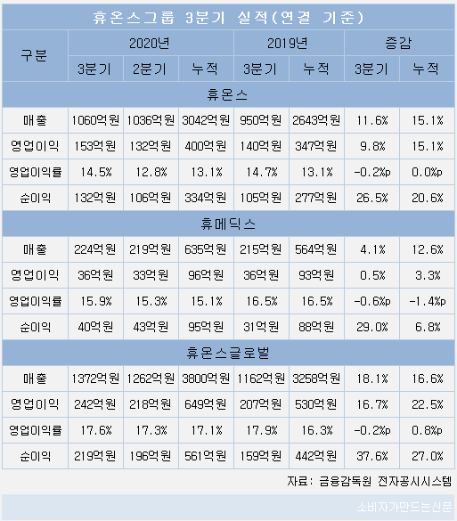 휴온스는 3분기 연결 기준으로 매출 1060억 원, 영업이익 153억 원을 기록했다. 전년동기 대비 각 12% 10%씩 증가했다. 3분기 누적으로는 전년동기 대비 15%씩 성장한 매출 3042억 원, 영업이익 400억 원을 기록했다.
