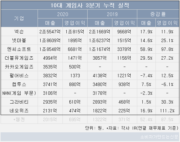 16일 금융감독원 및 각사 IR 자료에 따르면 3분기 실적을 발표한 10대 게임사의 올 3분기 매출은 3조242억 원으로 전년동기 대비 31.4% 증가했다. 같은 기간 영업이익은 8290억 원(NHN 제외)으로 30.5% 늘었다.