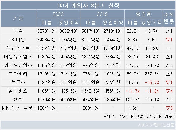 10대 게임사 중 매출은 펄어비스(대표 정경인)를 제외한 9개사가 늘었고, 영업이익은 게임부문을 따로 집계하지 않는 NHN(대표 정우진)을 제외한 9개사 가운데 7개사가 증가했다.