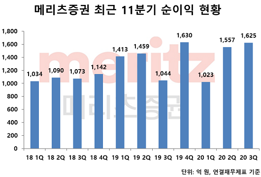 리테일채널이 약한 메리츠증권은 '동학개미운동'에 따른 반사이익을 크게 누리지는 못했지만, IB부문을 중심으로 꾸준한 수익 기조를 유지한 가운데 리테일 채널도 살아나면서 2분기와 3분기에 각각 순이익이 1557억 원과 1625억 원으로 성장세를 지속했다.