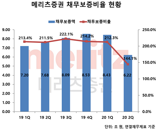 올해 2분기 말 기준 메리츠증권의 채무보증비율(자기자본 대비 채무보증액 비중)은 144.1%로 경쟁사 대비 높은 수준이지만 올 들어 채무보증액을 크게 줄여나가면서 개선되고 있다. 실제로 메리츠증권의 채무보증액은 지난해 4분기 말 8.53조 원으로 사상 최대치였지만 올해 2분기 말 6.22조 원으로 반년 만에 2.21조 원을 줄였다.