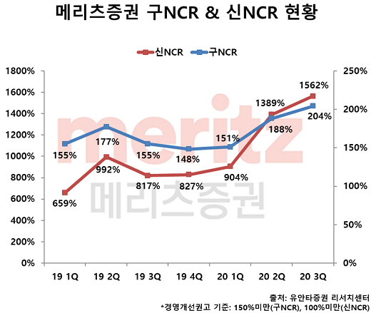 올해 3분기 말 메리츠증권의 신NCR은 전년 대비 745%포인트 상승한 1562%를 기록했고 구NCR은 같은 기간 49%포인트 상승한 204%로 안정적인 수치를 유지하고 있다.