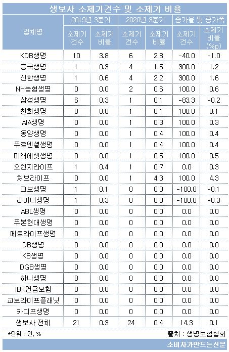 분쟁건수 대비 소제기 건수를 의미하는 소제기 비율은 처브라이프생명이 4.3%로 가장 많았으며 KDB생명 2.8%, 신한생명 2.2%, 흥국생명 1.5% 순이었다.