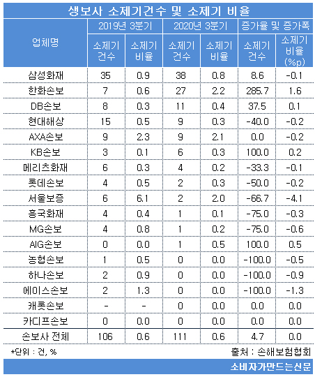 소제기 비율은 한화손해보험이 2.2%로 가장 높았으며 AXA손보가 2.1%, 서울보증보험이 2%로 상위권을 차지했다.