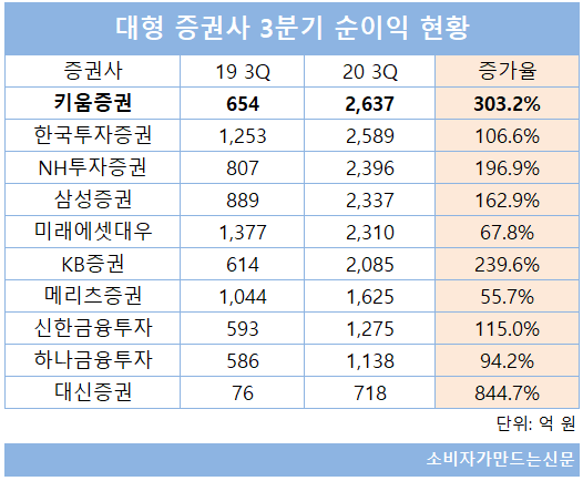 올해 3분기 국내 증권사 중 가장 많은 순이익을 낸 곳은 키움증권이었다. 키움증권은 3분기 순이익이 전년 대비 303.2% 증가한 2637억 원을 기록하며 분기 순이익 1위 증권사가 됐다. 한국투자증권(2589억 원), NH투자증권(2396억 원) 등 초대형 IB들을 제친 이변이었다.