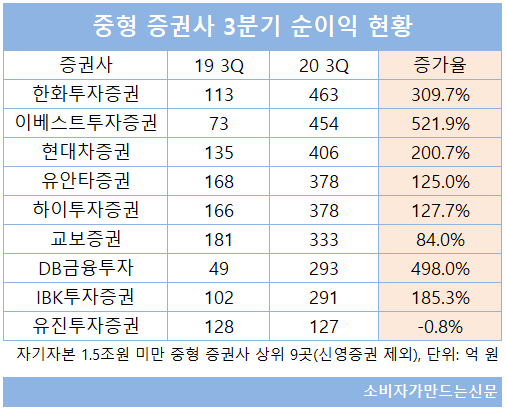 자기자본 1.5조 원 미만 중형 증권사 중에서는 한화투자증권(대표 권희백)이 3분기 순이익 463억 원을 기록하며 선전했다.