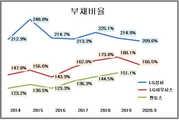 LG하우시스도 2014년 147.8%였던 부채비율이 지난해에는 180.1%로 치솟았다. 올 들어 9월에는 166.5%로 낮아진 게 위안거리다. 판토스도 지난해 말 부채비율이 151.1%다. 부채비율은 통상 100% 이하를 우량하다고 본다.