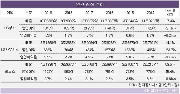 같은 기간 LG하우시스는 영업이익이 53.7%나 줄었다. 특히 2015년부터 지난해까지 4년 연속 영업이익이 줄고 있다. 1500억 원 안팎이던 영업이익은 지난해 700억 원 이하로 감소했다.