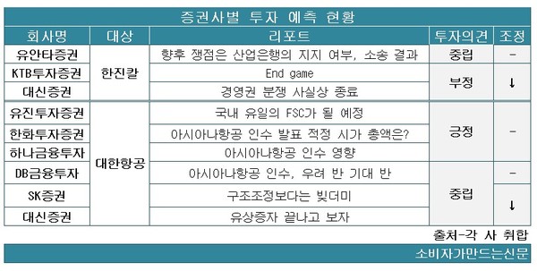 대한항공의 경우 유진투자증권과 한화투자증권, 하나금융투자 등이 긍정적 투자의견을 내놓은 데 비해 DB금융투자와 SK증권, 대신증권은 중립의견을 견지했다. 한진칼에 대해서는 유안타증권이 중립의견을 낸 반면, KTB투자증권과 대신증권은 부정의견을 내놓았다.
