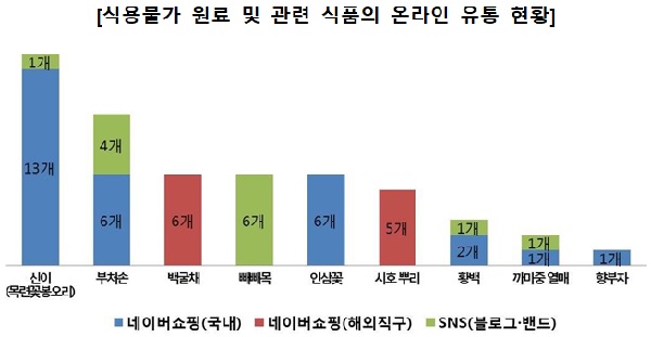 한국소비자원 조사 결과 식품 원료로 사용이 불가한 신이(목련 꽃봉오리), 부처손, 백굴채, 빼빼목, 인삼꽃, 시호 뿌리, 황백, 까마중(열매), 향부자 등 9종의 원료 및 이를 함유한 식품 53개가 네이버 쇼핑과 SNS(블로그‧밴드) 등에서 판매되고 있었다.