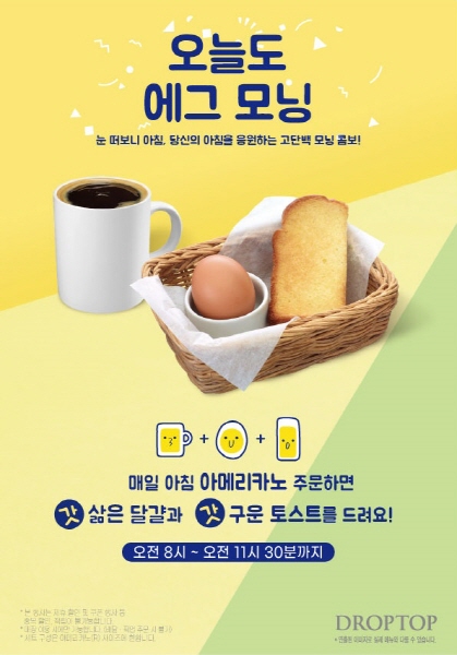 카페 드롭탑의 ‘모닝서비스’는 18일부터 전국 오프라인 매장(일부 매장 제외)에서 아메리카노 R(레귤러) 사이즈를 주문하는 고객에게 갓 구운 토스트와 갓 삶은 달걀을 무료로 제공한다.