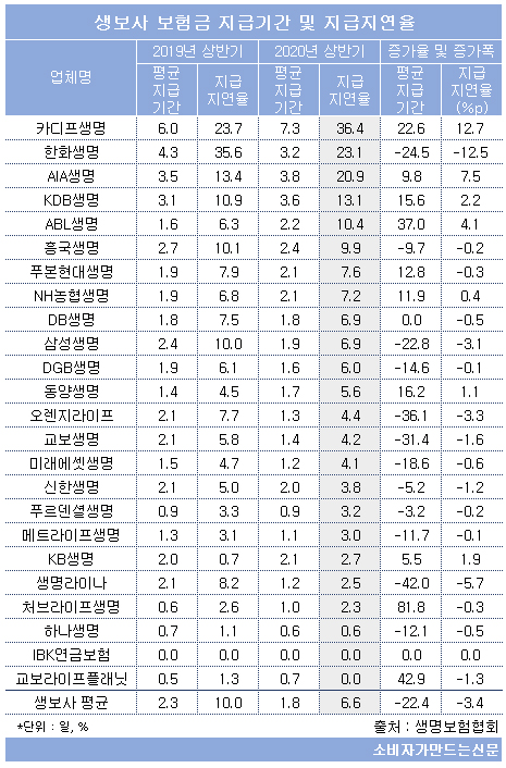 평균 지급 기간이 가장 긴 곳 역시 카디프생명(7.3일)으로 경쟁사들에 비해 2배 이상 늦어졌다. AIA생명(3.8일), KDB생명(3.6일), 한화생명(3.2일) 등 4곳이 3일을 넘어섰다.