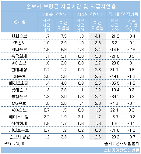 손보사 가운데서는 한화손해보험이 지급지연율 4.1%로 가장 높았다. 한화손보는 지난해 상반기 지급지연건수 1만9409건에서 올해 상반기 1만1847건으로 절반 가까이 줄이면서 지급지연율이 3.4%포인트 줄었다. 이어 KB손해보험이 3.8%, 하나손해보험 3.4%, 흥국화재 3.3% 순이었다.