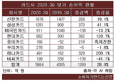 이외에도 삼성카드(대표 김대환)가 41.1%, 신한카드(대표 임영진)가 19.1%의 순이익 증가율을 기록했다.