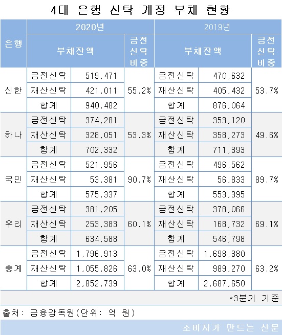 4대 은행의 올해 3분기 기준 전체 신탁에서 금전신탁이 차지하는 비중과 규모는 신한은행 55.2%(51조9471억 원), 하나은행 53.3%(37조4281억 원), 국민은행 90.7%(52조1956억 원), 우리은행 60.1%(38조1205억 원)이다. 우리은행을 제외한 나머지 3개 은행의 금전신탁 비중이 오히려 지난해 보다 상승했다.