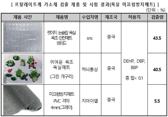 유해물질 시험 결과 조사대상 욕실 미끄럼방지매트 20개 중 3개(15.0%) 제품에서 안전기준(0.1% 이하)을 최대 435배(최소 5.5%~최대 43.5%) 초과하는 프탈레이트계 가소제가 검출돼 기준에 부적합했다.