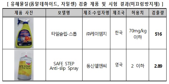 시험 결과 조사대상 미끄럼방지제 10개 중 2개(20.0%) 제품에서 안전기준(폼알데하이드 70mg/kg 이하, 자일렌 2% 이하)을 초과하는 유해물질이 검출(폼알데하이드 516mg/kg, 자일렌 2.89%)돼 부적합했다.