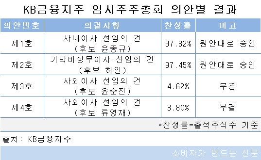 KB금융은 20일 오전 임시 주주총회을 진행했다. 이날 KB금융 임시주총에 상정된 4개 안건은 ▲사내이사 선임의 건(윤종규) ▲기타비상무이사 선임의 건(허인) ▲사외이사 선임의 건(윤순진) ▲사외이사 선임의 건(류영재) 등이었다.