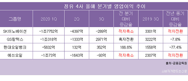 국내 정유 4사 가운데 SK이노베이션(대표 김준)과 에쓰오일(대표 후세인 알 카타니)은 올해 3분기에 적자를 기록했고, 현대오일뱅크(대표 강달호), GS칼텍스(대표 허세홍)은 영업이익이 지난해 3분기에 비해 감소하는 등 코로나19사태에 따른 침체가 지속됐다.