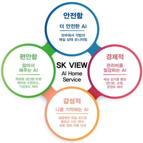 스카이는 기존 IoT형 스마트홈과 달리 스마트폰 또는 세대 내 월패드에서 조작하지 않아도 인공지능과 음성만으로 제어를 할 수 있다. SK건설은 이 기술을 SK뷰 단지에 단계적으로 적용할 방침이다.
