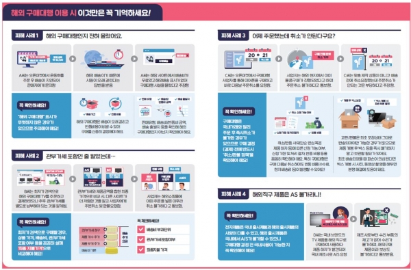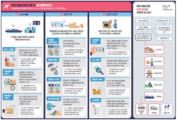 ‘구매대행’ 이용가이드에서는 소비자피해 다발 사례를 바탕으로 계약 체결 전 반드시 체크해야 할 사항들을, ‘배송대행’ 이용가이드에서는 관련 용어와 이용절차, 주의사항 등을 Q&A 형식으로 알기 쉽게 정리했다.