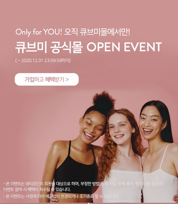 다음달 31일까지 큐브미 제품 한 개만 사도 무료 배송한다. 웰컴선물 5000원, 큐브미 대표 제품 1+1, 구매 금액별 사은품 지급 등의 행사를 한다.